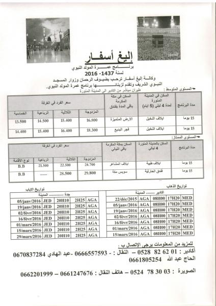 وكالة إليغ للسياحة والأسفار بأكادير و فرعها بالصويرة، ينظمان عمرة عيد المولد النبوي ، بأسعار تنافسية وخدمات متميزة، حسب البرنامج المرفق، للتسجيل أو لمزيد من المعلومات، يرجى الاتصال بفرع الوكالة بالصويرة بشارع الاستقلال (الحدادة) الكائن بالطبق الأول فوق مكتب الصرف وقبالة زنقة الخبازين ومحل بيع التوابل الشهير (العطريية)، أو بالرقمين الهاتفيين : الثابت: 0524783003-المحمول:0662201999 أو 0661247676، أو بالمكتب المركزي للوكالة بأكادير على الرقمين: 0528826201 أو 0661805254